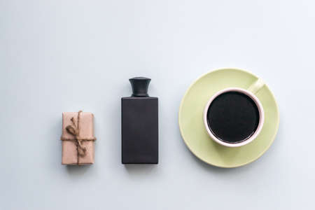 Gift box with kraft paper, toilet water and a mug with black coffee on a light blue background. Flat lay for father's day concept.