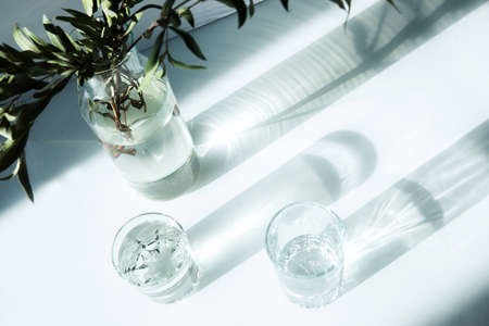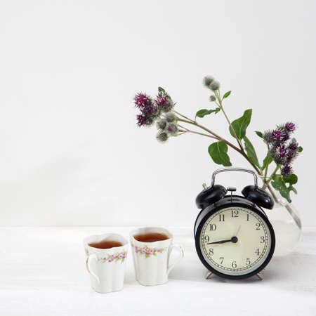 Copy space. Still-life with porcelain cups with tea and burdock in a vase on the white table