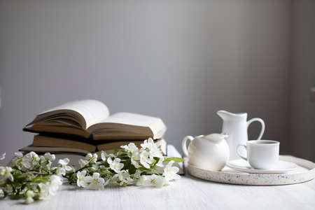A branch of a blossoming apple tree or cherry on an open book and cup of coffee on a background of a grey wall. Concept - online learning. Copy space. Education on-line