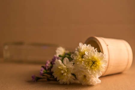 Notebook with dry flowers on yellow wooden desk. blue wall background. copy space
