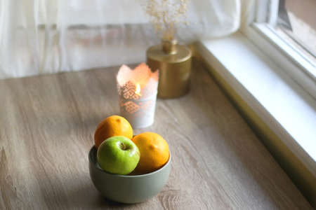 Bowl of lemons and apples, candle holder with lit candle and vase with gypsophila flowers on the table. Bokeh lights in the background. Selective focus.