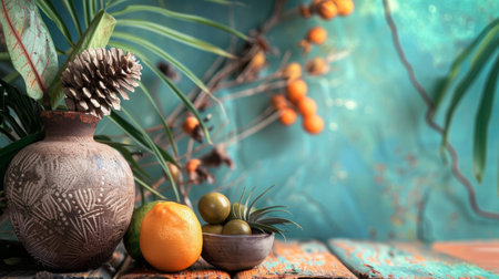 A rustic vase with a pinecone and green leaves, alongside fresh fruits, set on a wooden table with a colorful background.