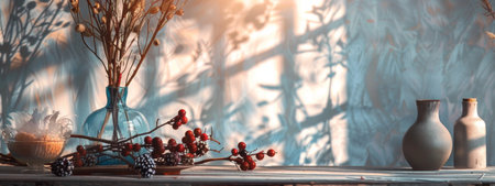 A still life featuring a blue vase and red berries on a rustic wooden table, with soft shadows cast by sunlight, creating a warm and peaceful atmosphere.