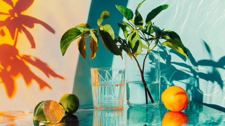 A composition of citrus fruits, glasses, and a small plant casting shadows on a brightly lit background. The image captures the freshness and vibrancy of summer.