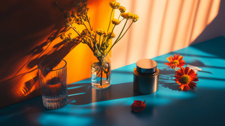 A vibrant still life featuring orange and yellow flowers in glass vases, illuminated by warm natural light.