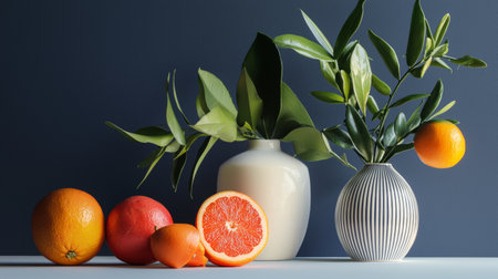 A vibrant arrangement of fresh oranges and green leaves placed in sleek modern vases on a dark surface.