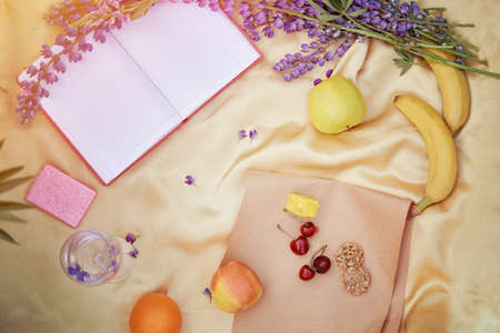 Open notebook mock up with wine glass, lupins purple flowers, apple, bananas, cherry, halva, cookies on golden background. summer picnic. Place for text. Closeness to nature, self-discovery concept