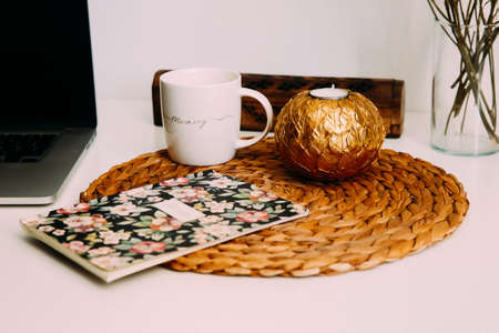 Home office workspace with laptop, candle holder, mug, notebook, grass bouquet. Light aesthetic hygge space. Freelance work, business workplace.