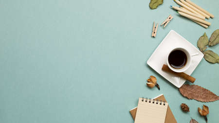 Autumn concept. Notebook and black coffee with dry leaves on green background. flat lay, top view, copy space. Work and study place