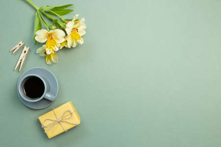 Yellow gift box, flower bouquet, cup of coffee on green background. flat lay, top view, copy space