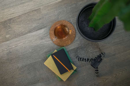 Top view on the wooden floor with books, notebook, action cam and cup of tea. Cozy, relaxing and peaceful atmosphere. Recording equipment and shooting video. Home working, content creators concept.