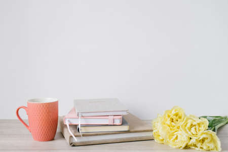 Woman's coffee break at workplace. A mug, a bouquet of tulips and a stack of notepads on the table. copy space