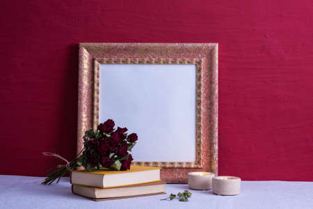 Bouquet of roses, candles and gifts, card for February 14, St. Valentine, March 8, wedding, birthday, mother's day, blurred background, bokeh.