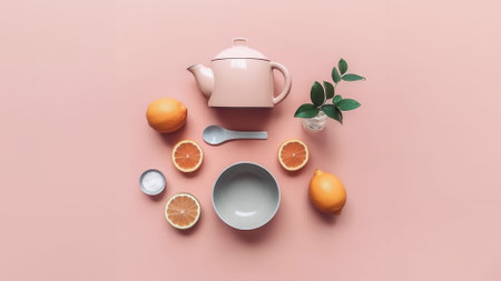 A teapot with lemons, a spoon, and a saucer isolated on a pale pink background. AI-generated.