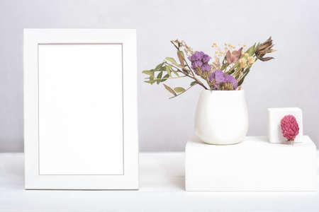 white frame with copy space and dry flowers ina vase on geometric podium or pedestal. template for text or inscription. mock up for sale advertisment or inspirational card.