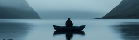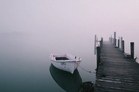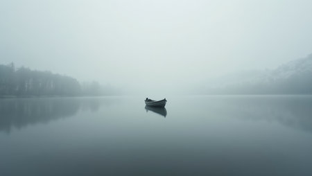 A tranquil scene of a lone boat floating on serene water, enveloped by misty fog. The simplicity of the composition evokes peace and solitude, inviting reflection.