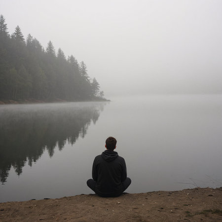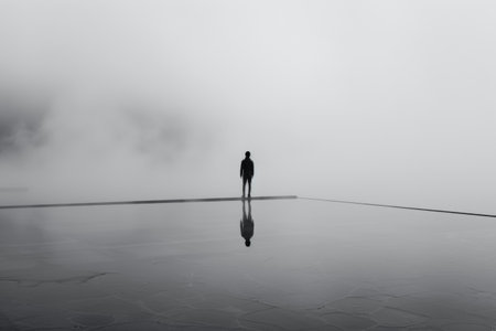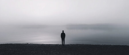 A person stands alone in dense fog, reflecting on lives challenges while looking for a path forward in a silent, unclear landscape.