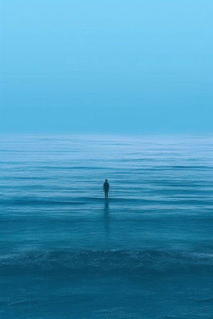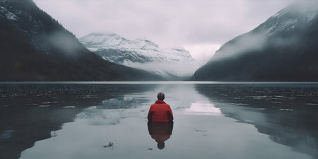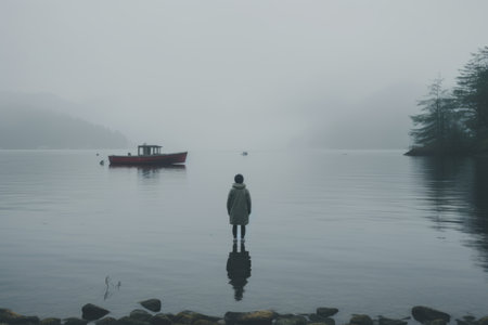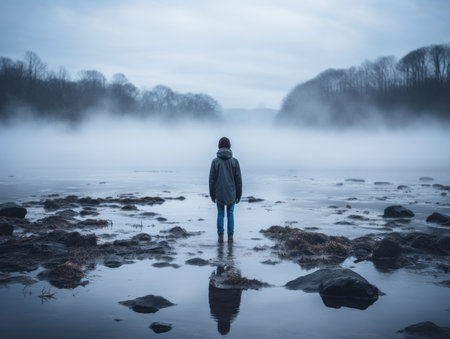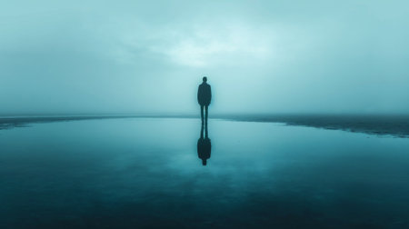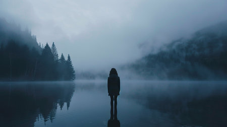 A solitary figure stands in a misty lake, its reflection mirroring the serene atmosphere.