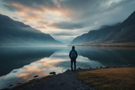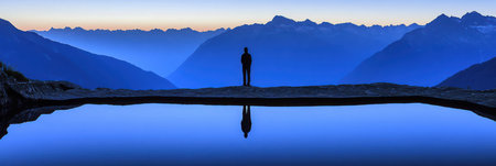 Silhouette contemplating reflective mountain lake at dawn providing tranquility and peace.