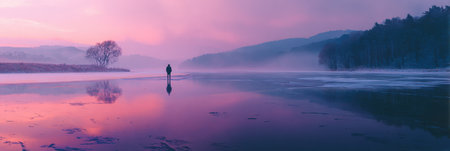 Twilight casts a purple hue over a tranquil lake where a lone person strolls along the icy shore, surrounded by misty mountains in the distance.
