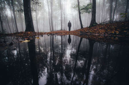 Man near lake in haunted forest with fog