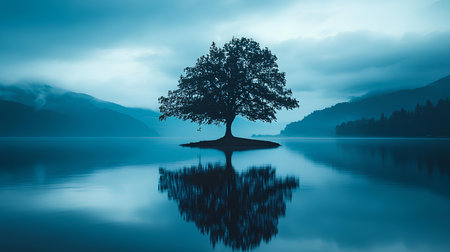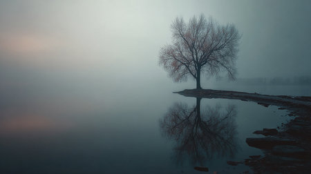 A stunning scene capturing a solitary tree standing by a calm lake, its reflection beautifully mirrored in the water beneath a gentle morning fog, evoking serenity and stillness.