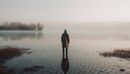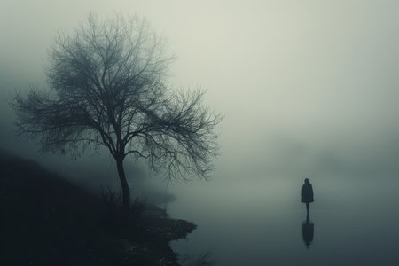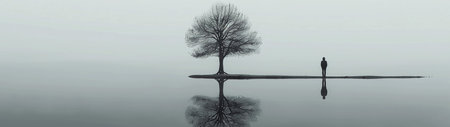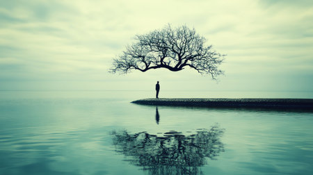 A person stands on a reflective water's edge beside a bare tree, creating a symmetrical composition in a quiet, mist-filled atmosphere. This serene image is a meditation on calmness and reflection in nature's embrace.