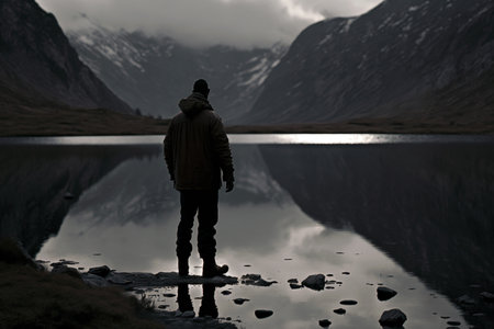Lonely man standing on the edge of a mountain lake.