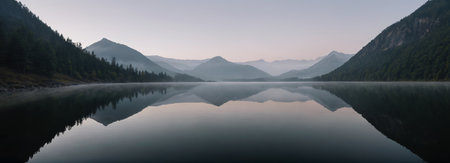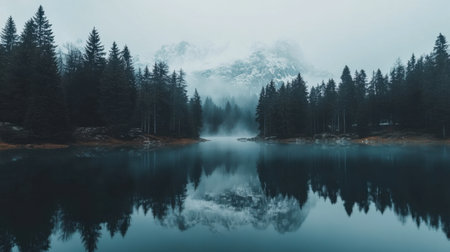 A picturesque scene of a misty lake surrounded by dense evergreen forests and majestic mountains, evoking feelings of tranquility and peace in nature