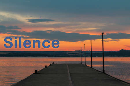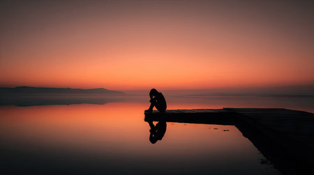 Silhouette of a lonely woman sitting on a wooden jetty at sunset