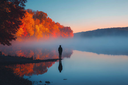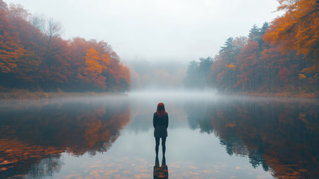 A solitary figure stands in calm water surrounded by colorful autumn foliage at dawn in a misty forest setting