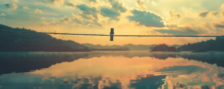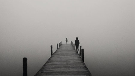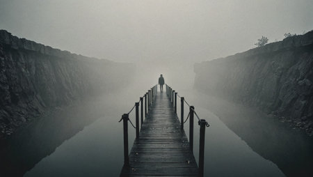 A solitary person sits quietly at the edge of a fog covered bridge, surrounded by an atmosphere of solitude and mystery during early morning.