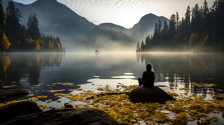 Tranquil Solitude Silhouette of Young Man by Misty Lake