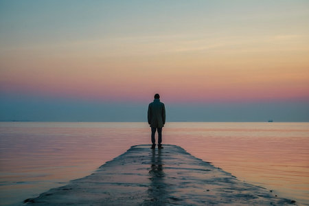 Silhouette of solitary figure on misty pier anime inspiration