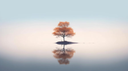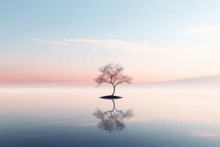 Minimalist perspective of a lone tree in reflective water, emphasizing isolation, tranquility, and natural symmetry