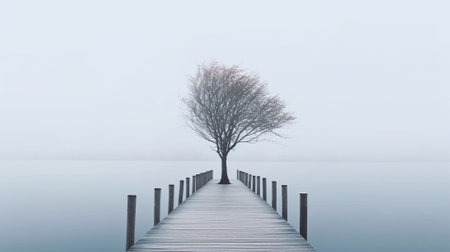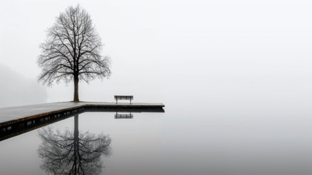 A tranquil scene featuring a solitary tree and a bench by a calm lake, enveloped in thick fog. The reflection in the water enhances the serene atmosphere.