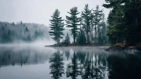 A serene lake scene captures the beauty of nature with fog enveloping pine trees, creating a tranquil atmosphere in early morning light.