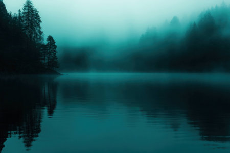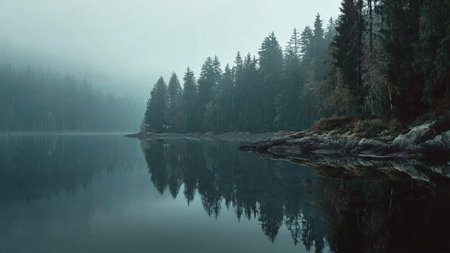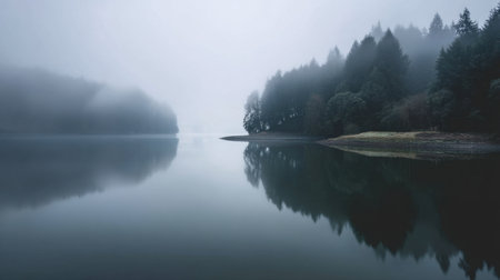 Serene foggy lake in a tranquil forest setting, with mist enveloping trees and calm water reflections, ideal for relaxation and nature imagery