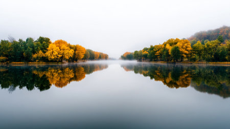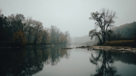 A tranquil river scene enveloped in fog, showcasing bare trees reflecting in the still water. This serene landscape captures the peaceful essence of nature in autumn.