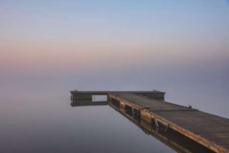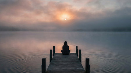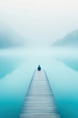 Surreal landscape symbolizing inner calm: foggy lake with lone figure sitting on a wooden pier, soft sunlight, gentle waves, muted colors, sense of serenity and digital silence