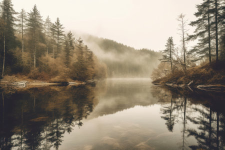 A body of water surrounded by trees on a foggy day. AI generative image.