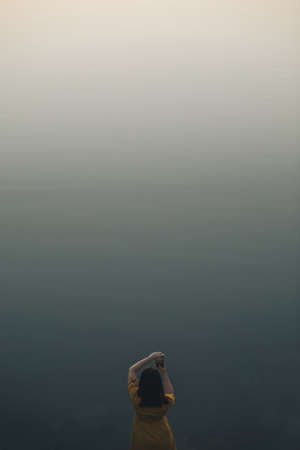young woman in yellow dress taking picture of grey lake. evening dusk time. dark mood. copy space