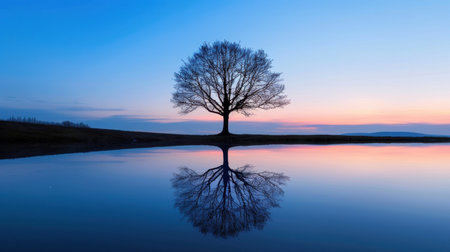This captivating image depicts a serene and minimalist landscape featuring the silhouette of a solitary tree reflected in the calm waters of a pond The pastel sky sets the stage for a tranquil and