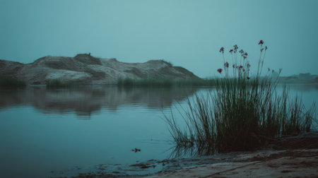A serene water body enveloped in soft morning fog, featuring delicate flowers and lush grass, capturing the tranquil beauty of a natural landscape at dawn.