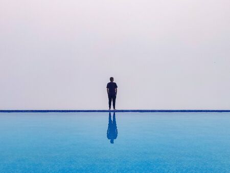 A guy standing at the edge of infinity pool with white foggy background