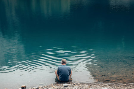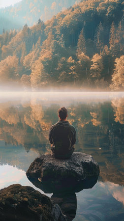A man sits on a rock by a lake, looking out at the water. The scene is peaceful and serene, with the man's reflection in the water adding to the sense of calm. Concept of solitude and contemplation