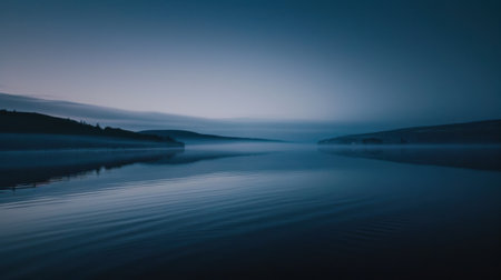 calm lake surrounded by fog, surface reflecting faint outlines of nearby trees landscape