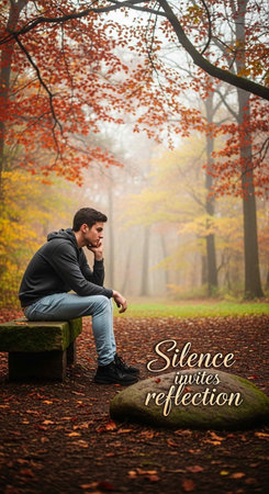 Young man sitting on a bench in an autumn forest with a motivational quote