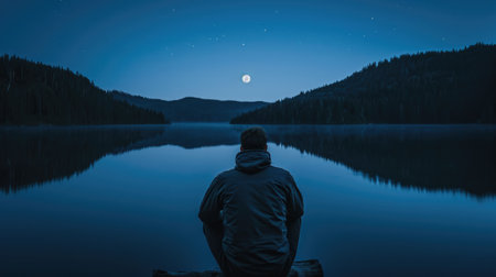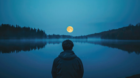 person with their back, watching the reflection of the moon on a calm lake at midnight generative ai