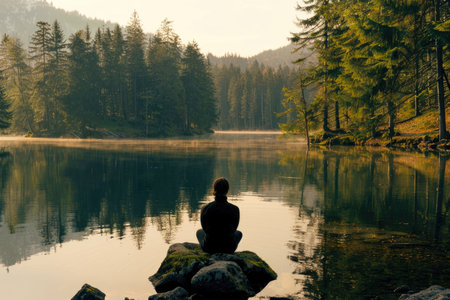 A masterful photograph depicts a person sitting in profound meditation in the heart of a tranquil wilderness Every intricate detail of nature from the delicate ripple of a nearby lake to the vibrant hues of foliage comes to life embracing the essence of mindfulness and connection to nature within the frame capture the profound stillness the gentle whispers of leaves and the tranquil aura that encapsulates the scene inviting viewers into a moment of peaceful introspection Let the photograph inspire a deep sense of calm unlocking the power of mindfulness and promoting mental wellbeing
